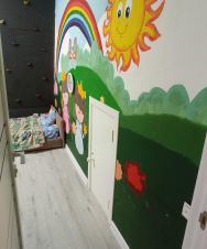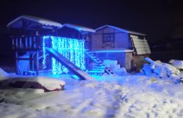 Также смонтирована детская площадка с горкой и качелями.
