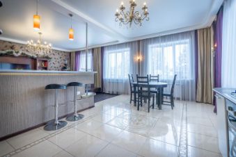 Зона гостиной переходит в удобную кухню 21 кв.м., которая отдельная, но при этом объединена с общим пространством гостиной.