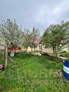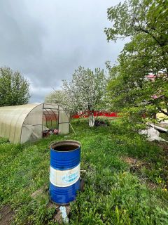 Участок: ровный, с плодово-ягодными насаждениями; баня, хозблок, беседка, теплица из поликарбоната; забор вокруг участка.