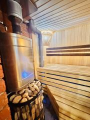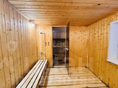 На благоустроенной территории расположена баня, построенная из шлакоблока, отделанная сйдингом. В бане центральное водоснабжение, санузел, тёплый пол. Так же на участке расположены хозпостройки, мастерская.