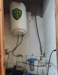 Горячая вода - нагреватель 50 метров с нержавеющим теном, холодная вода насосная станция с погружением в колодец.