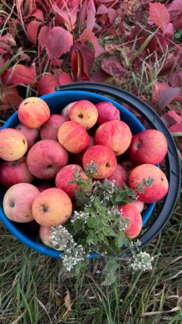 Фруктовые деревья и кустарники (яблони, абрикос, вишня, желтая слива, черноплодная рябина, облепиха, барбарис, крыжовник). Земля отдохнувшая.