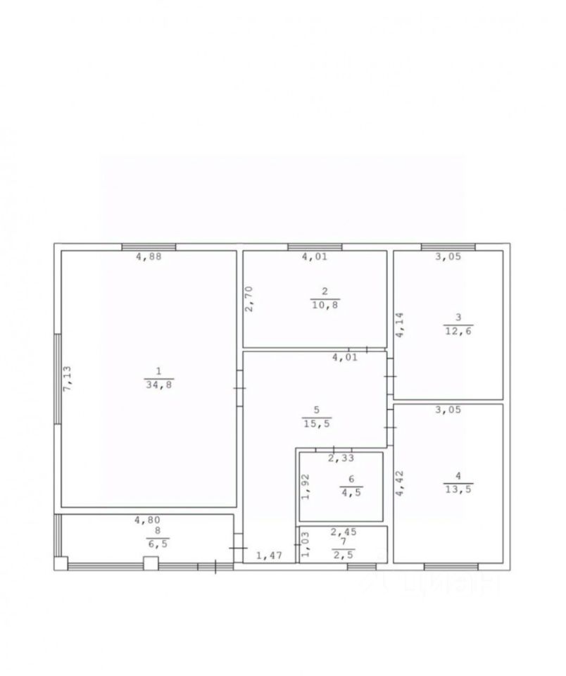 3 спальни, гостиная с кухней, ванная комната, котельная, прихожая, веранда.