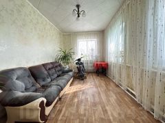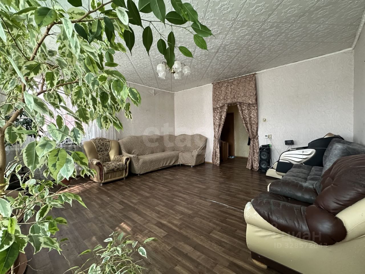 В доме высокие потолки, на стенах обои, на полу линолеум, окна пластиковые.