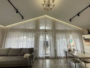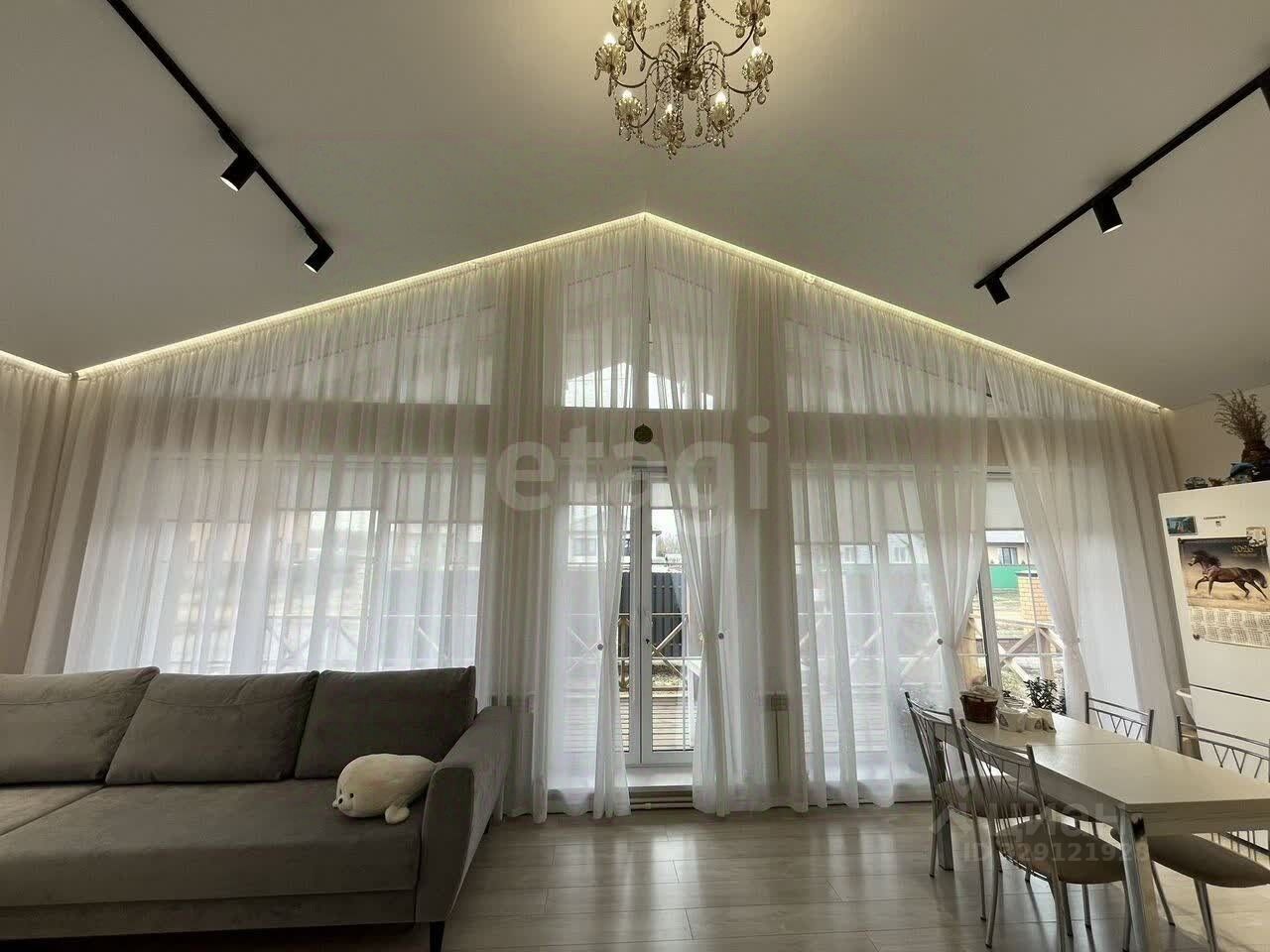 В доме кухня - гостиная с высоким потолком и вторым светом с новым встроенным кухонным гарнитуром. Перегородки между комнатами кирпичные.Потолки сатиновые натяжные с трековым освещением и встроенными лентами. Три отдельные спальни, душ и туалет раздельно + в котельной.