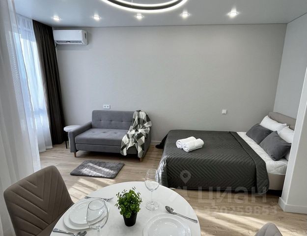 Студия Глубокое синее небо на 20 этаже в доме премиум-класса "The Prime" на Проспекте Октября рядом с Уфимским цирком, парком им. Гафури и Русским Драмтеатром. Для кофеманов есть кофеварка, кофе и чай.