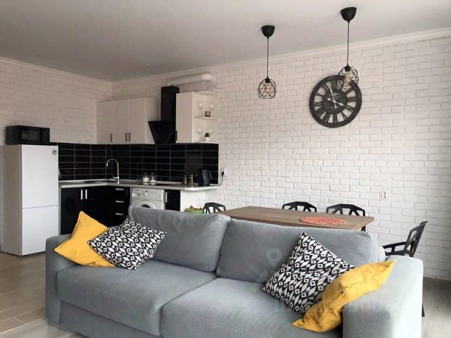 просторная квартира студия, с отдельной спальней, и гостиная -кухня. (50кв. М). 1 комната с большой 2х спальной кроватью и шкафом. 2 комната: гостиная -кухня, в ней большой разборный диван-кровать, +диван разборный, кресло-кровать. Вместимость до 6 человек.