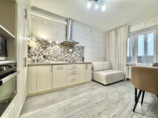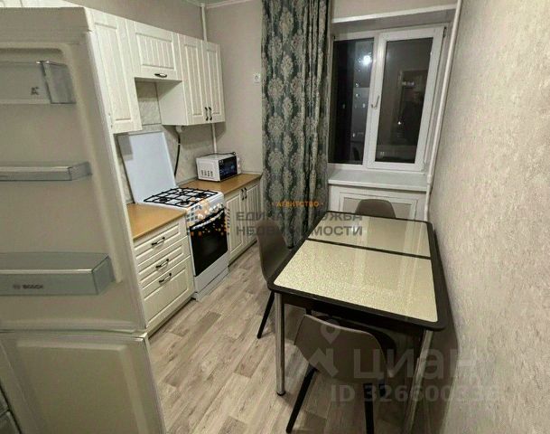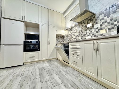- встроенный кухонный гарнитур, электрическая плита со стеклокерамическим покрытием, вытяжка, микроволновая печь, большой двухкамерный холодильник, обеденный стол и стулья.