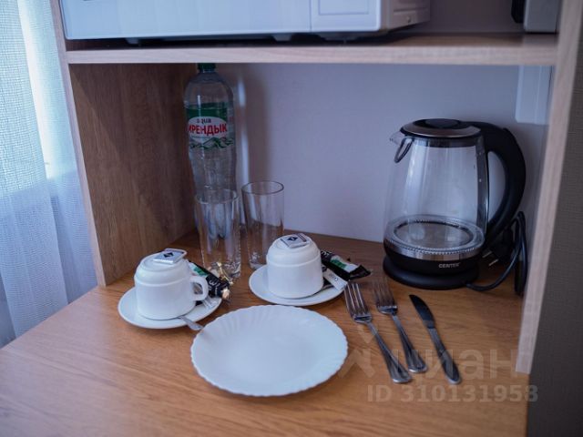 В спальне расположена двухспальная кровать, макияжный стол, смарт ТВ, умная колонка Алиса, на полу - ковровой покрытие, плотные шторы, красивая подсветка. В гостинной есть раскладной диван, качели, рабочий стол, кухонный стол, журнальный столик. Также номер оборудован: джакузи, феном, кондиционером, СВ печью, чайником с чашками и посудой, холодильником. В номере есть халаты, тапочки, косметические средства.